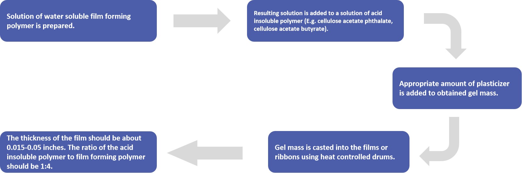 The principle of semi-solid casting technology for oral thin film preparation is to prepare a solution of water-soluble film-forming polymer; the resulting solution is added to a solution of acid-insoluble polymer (e.g. cellulose acetate phthalate, cellulose acetate butyrate), which was prepared in ammonium or sodium hydroxide. Then, an appropriate amount of plasticizer is added to obtain a gel mass. Finally, heat-controlled drums cast the gel mass into the films or ribbons.